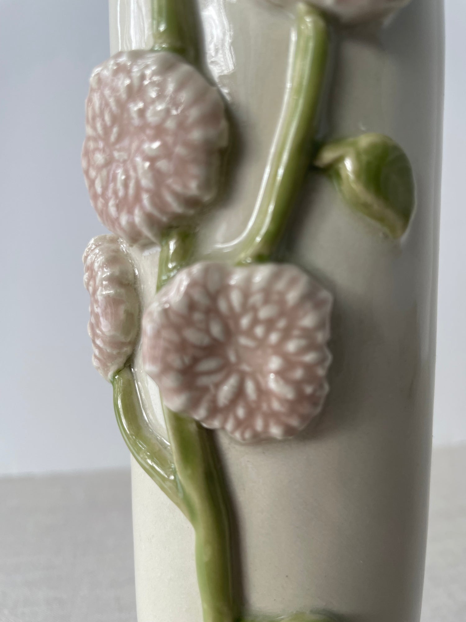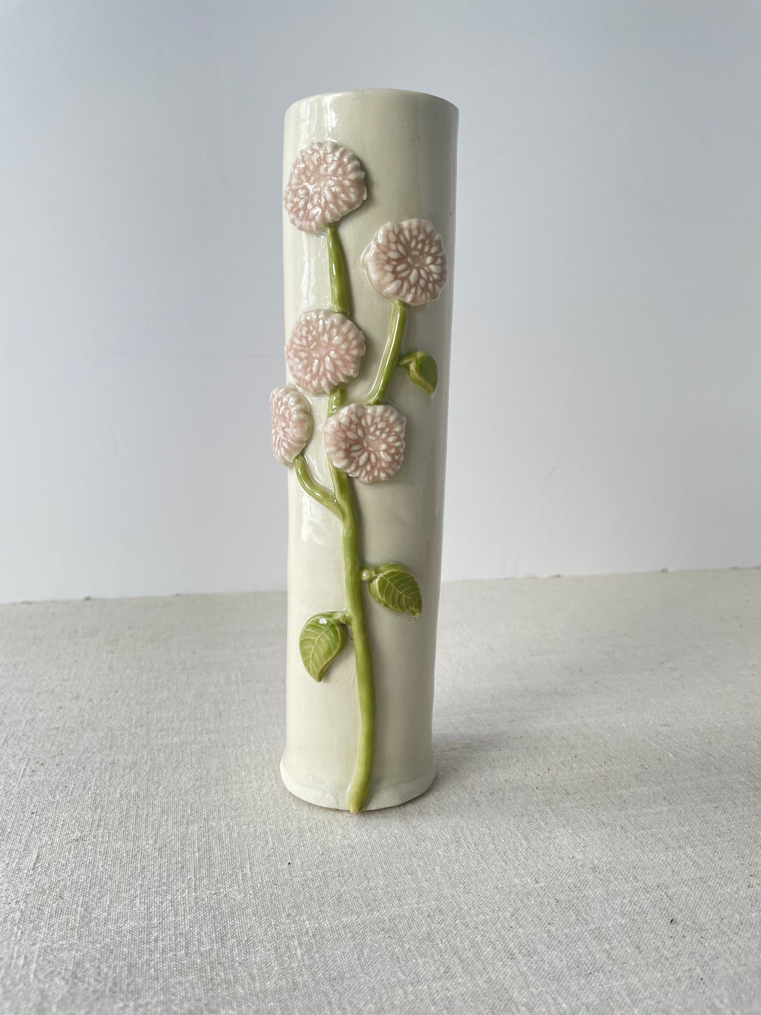 The ceramic vase is truly handmade using a rolled slab of clay, to which I attached individual sprigs of blooms and leaves made from molds. Once the piece was allowed to dry slowly and then fired, I painted each bloom a blush pink shade and dipped the form in a shiny clear glaze for durability and gloss.Â