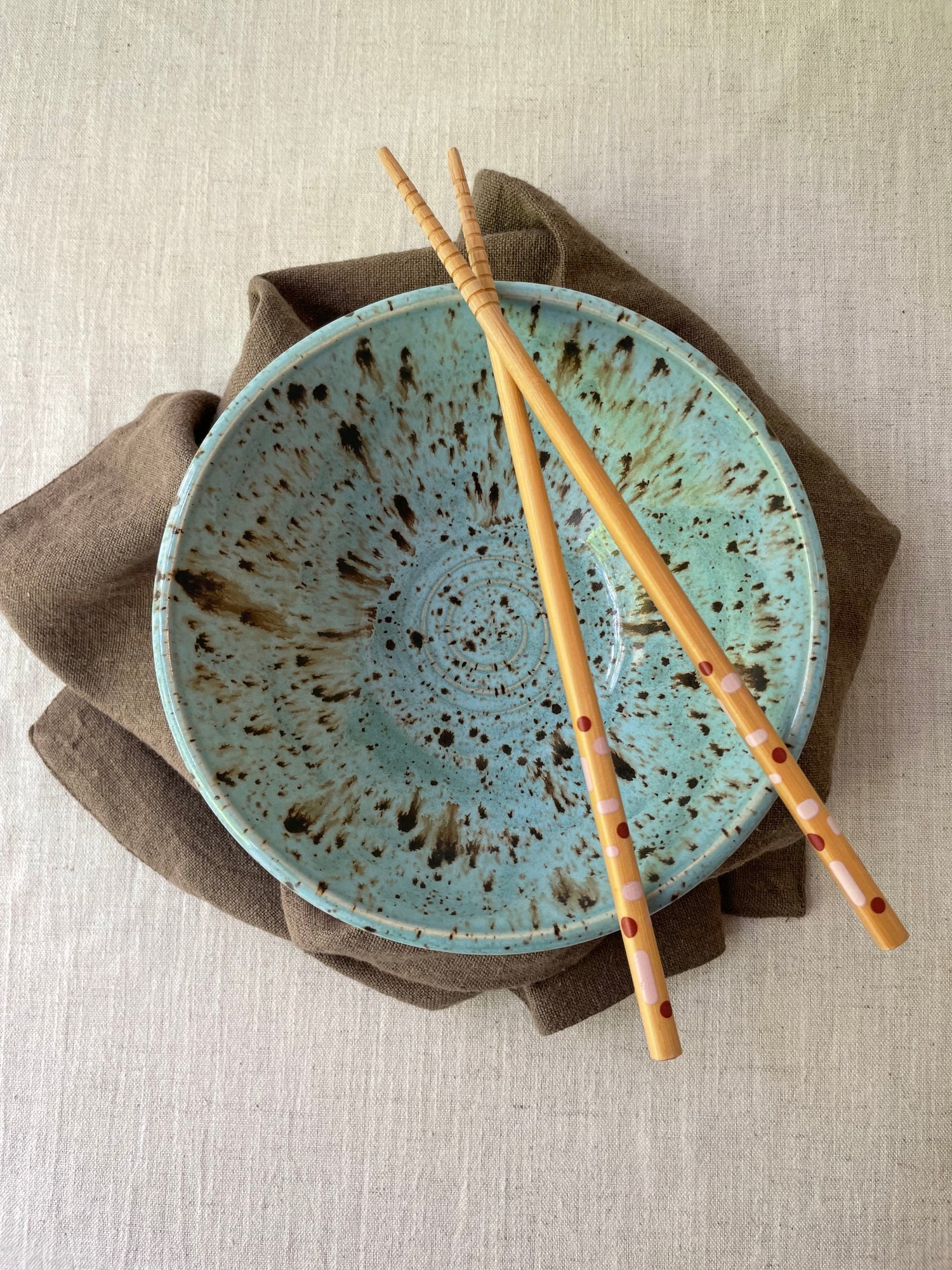 Made of speckled clay, this bowl is glazed with a flowing glaze of cerulean and warm brown flecks for a rustic yet chic effect.Â