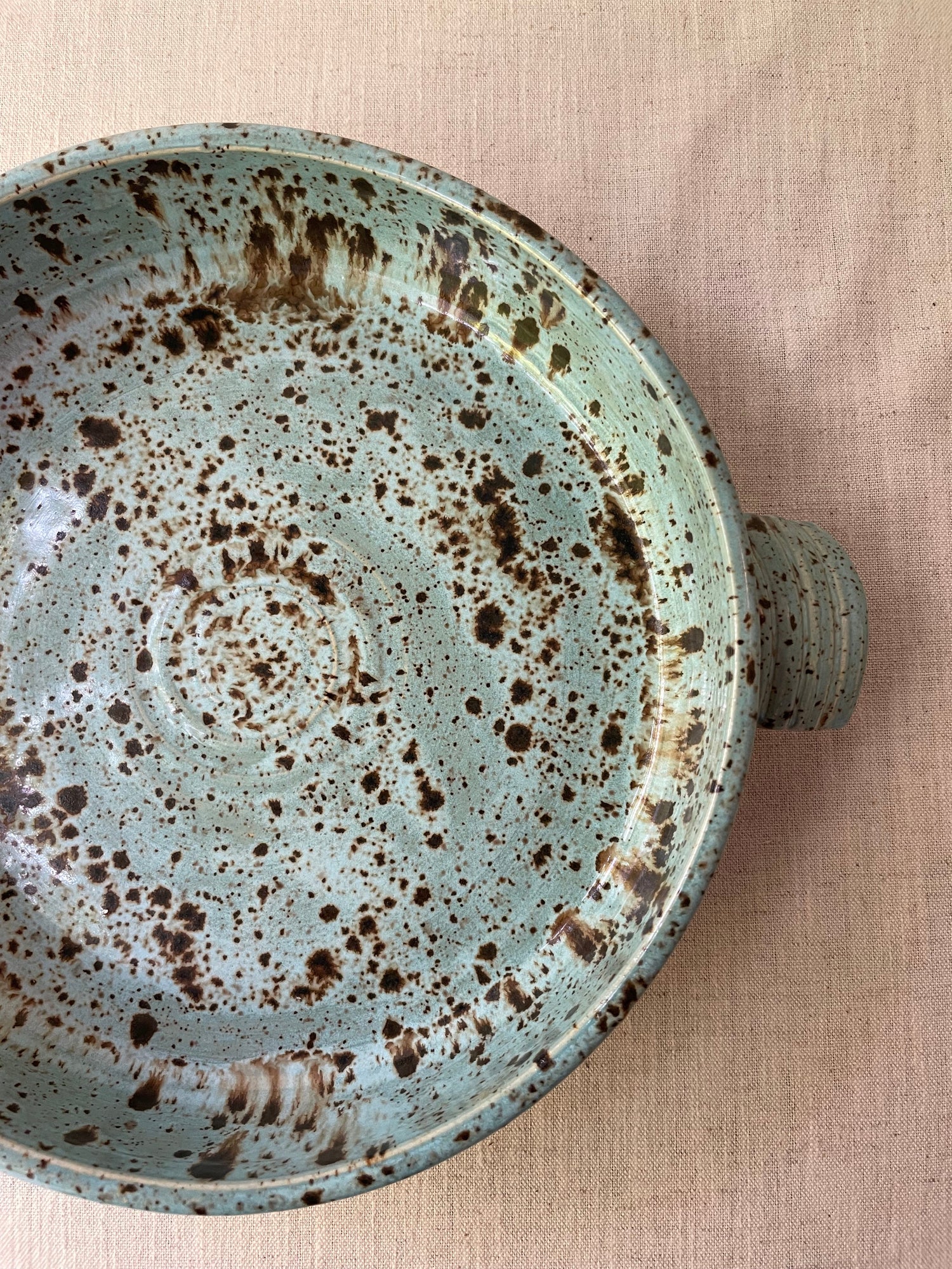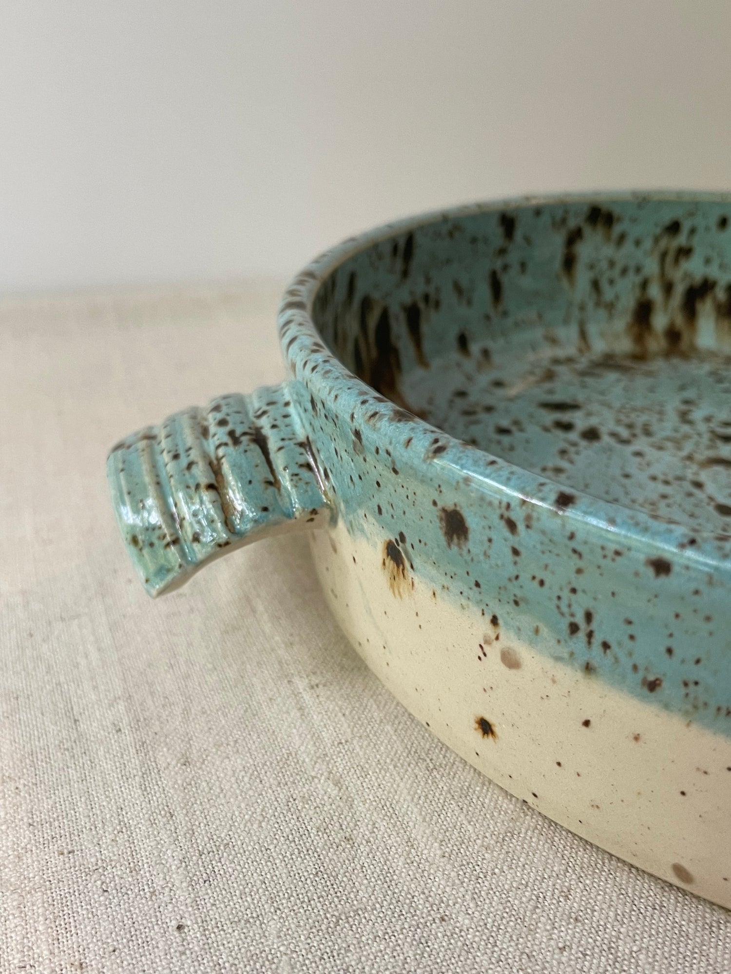 This casserole started thrown on the wheel, after which I impressed a spiral in the bottom, added texture to the exterior, formed handles and adhered these to the casserole. After being fired in an electric kiln, I choose this warm bright blue glaze speckled with rich brown to complement the speckled clay.
