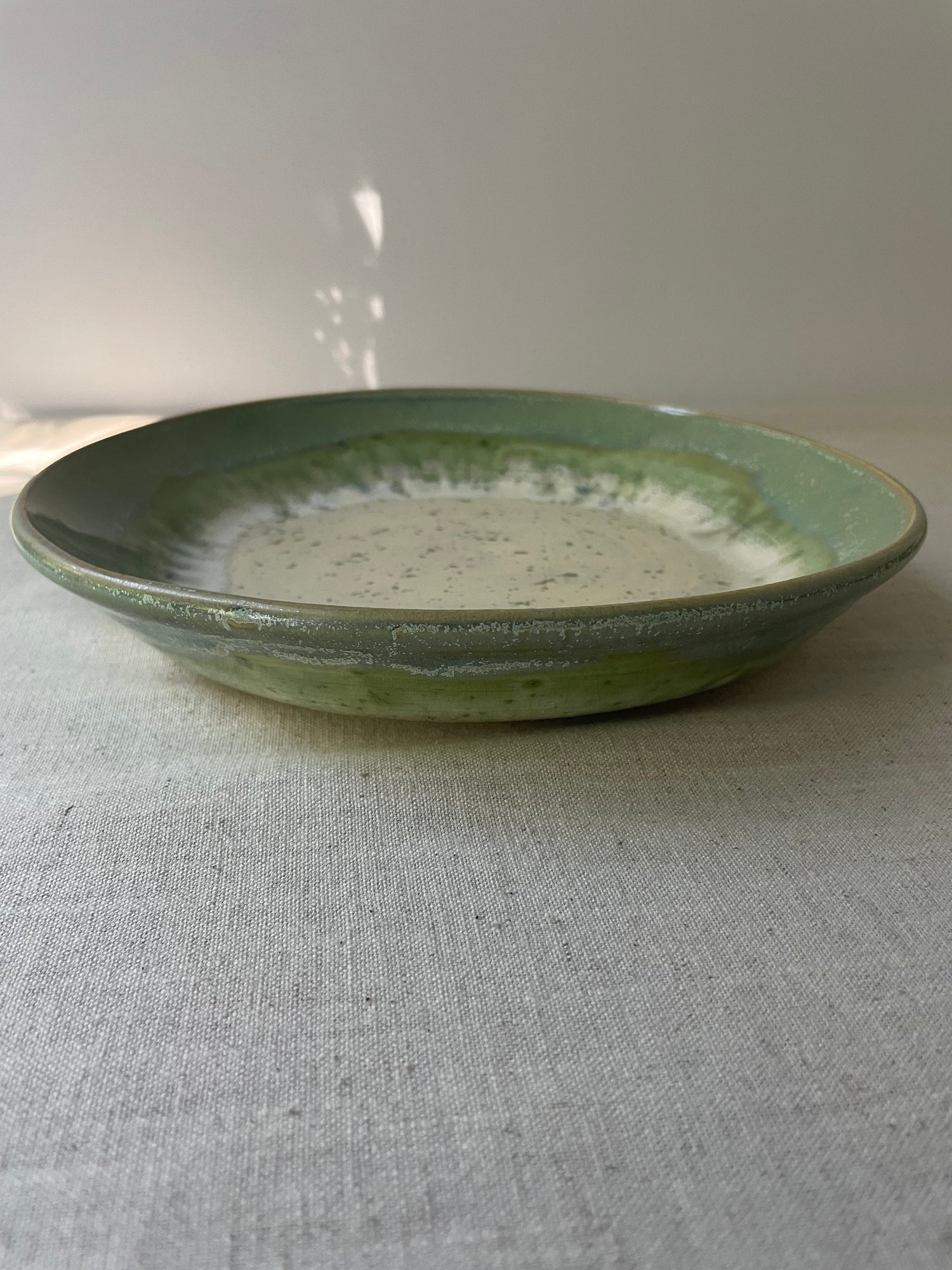 Made of stoneware clay, this serving plate is glazed with a creamy speckled green glaze overlaid with a iridescent green along the rim for an elegantly organic style. This plate adds a rustic yet chic style to your festive table.