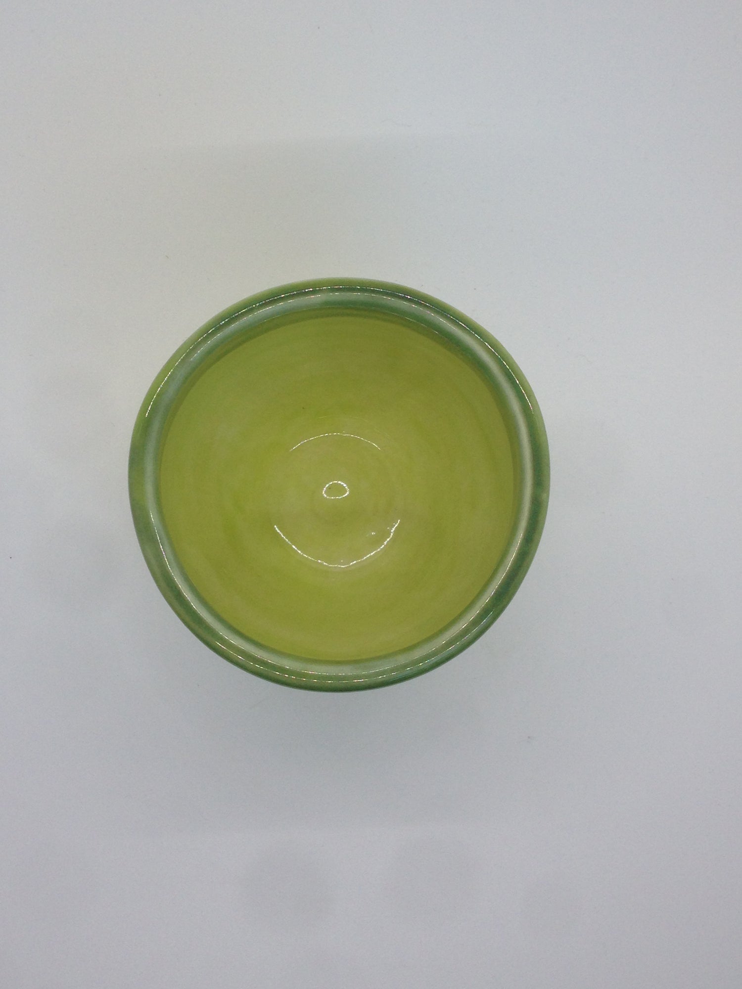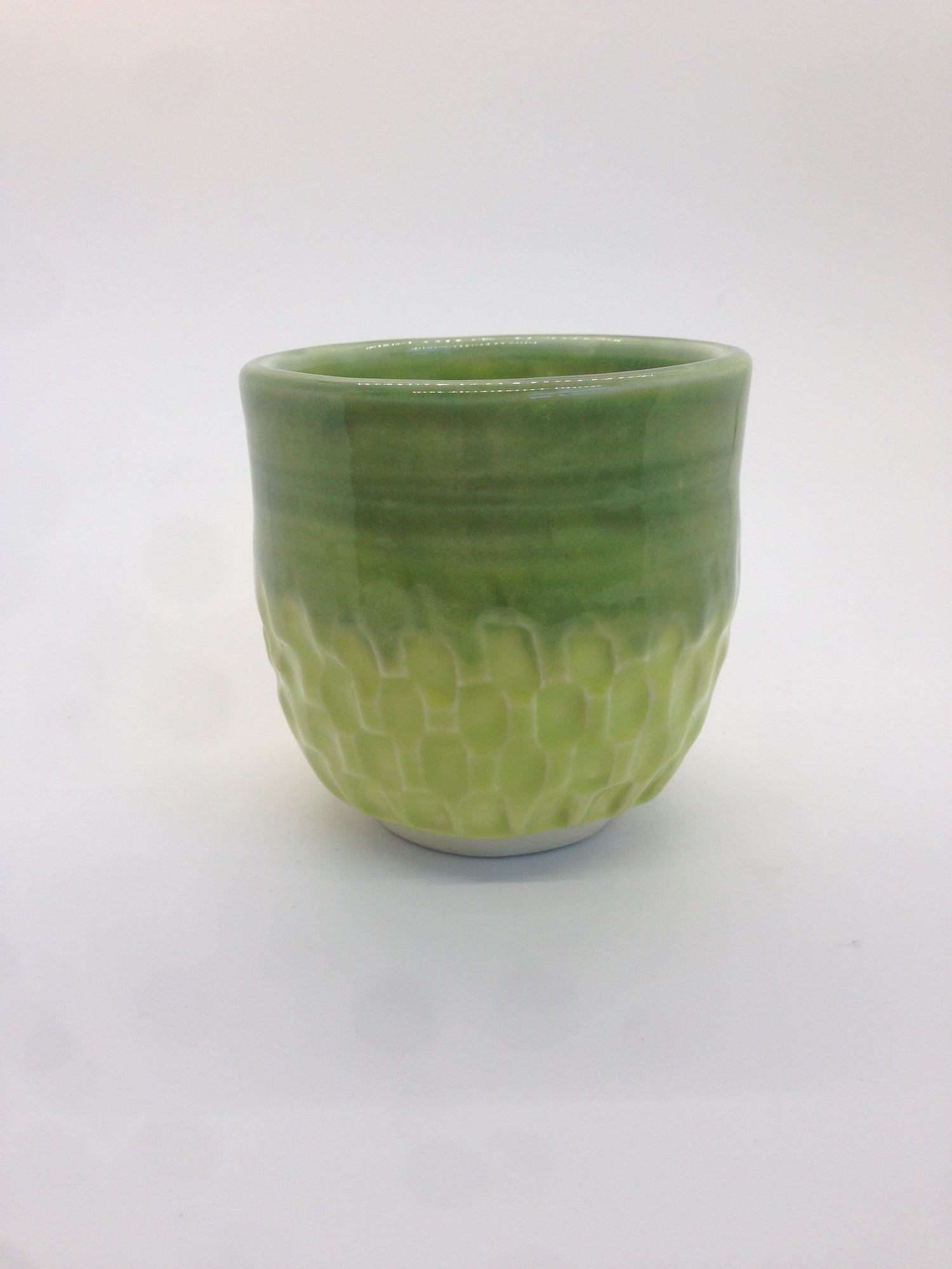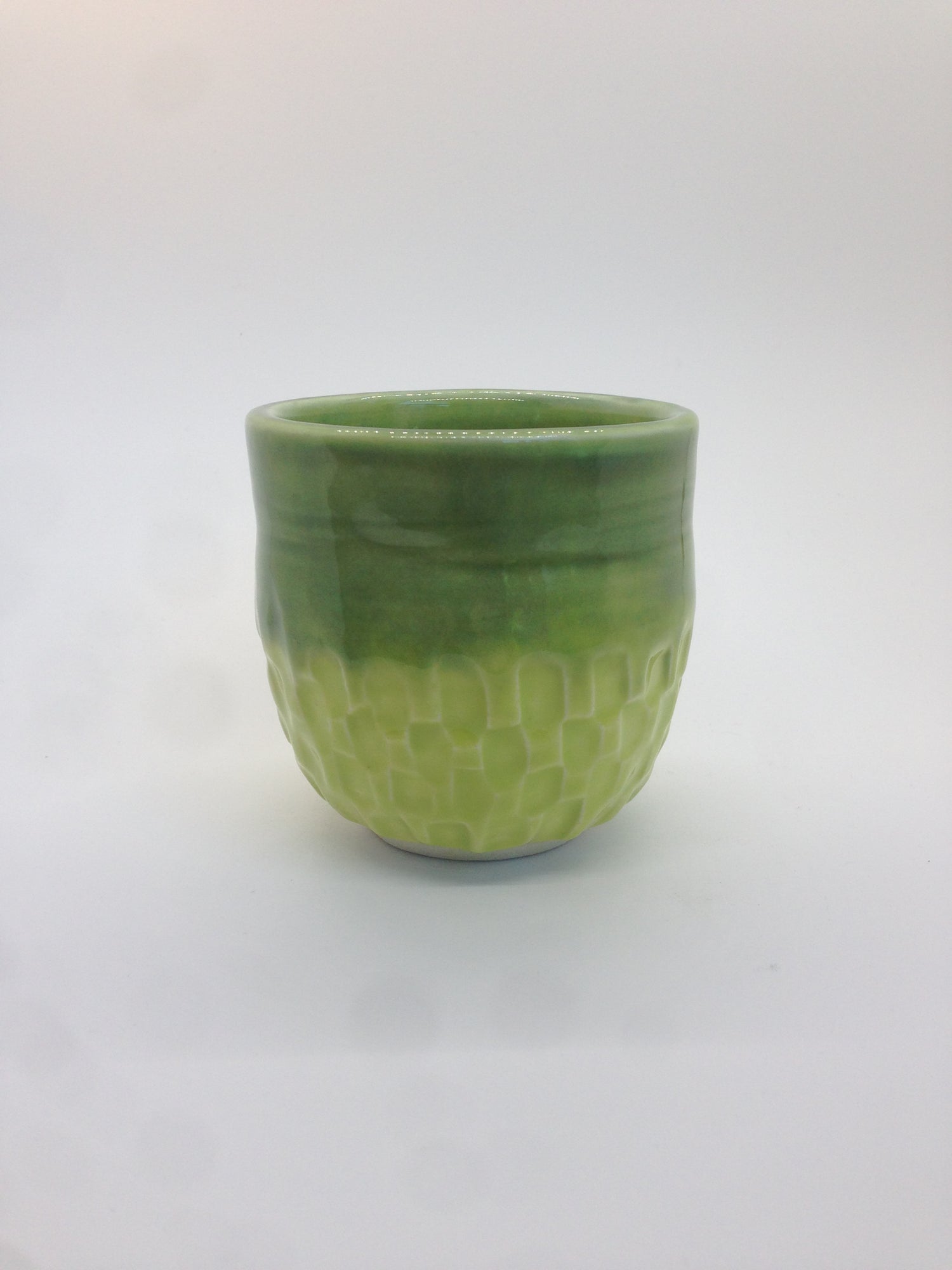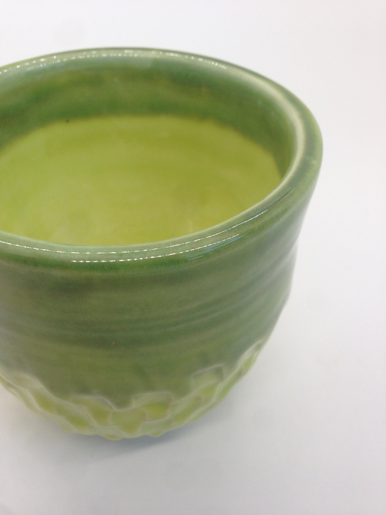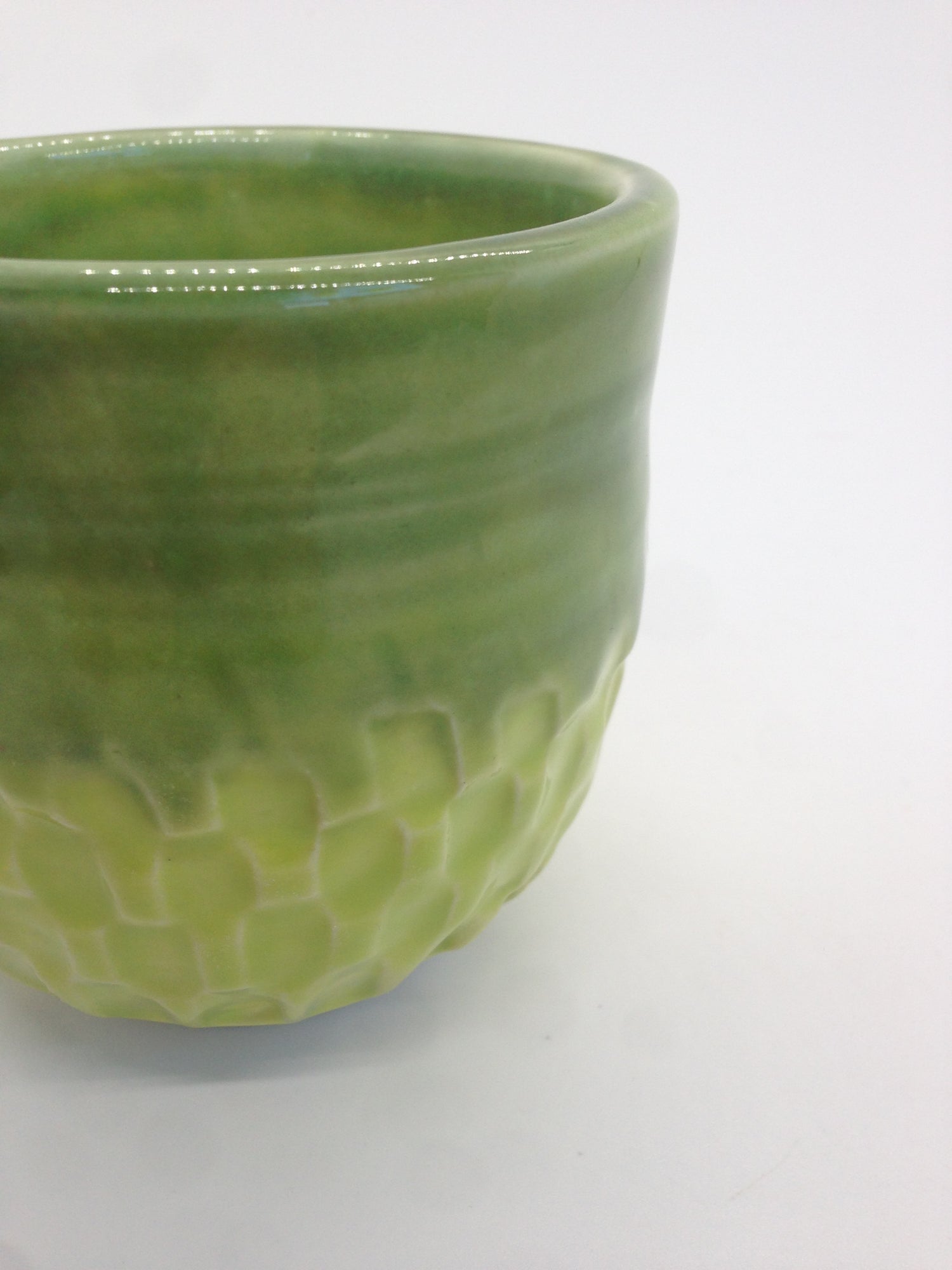 This item was thrown and trimmed on the wheel, after which I cut overlapping facets around the lower half. After its first firing in an electric kiln, I glazed the entire surface with three coats of a pale-lime-green glaze designed to vitrify the surface and add shine. Next, I overlapped a muted leafy green to echo natural plant tones and fired it for the final time.