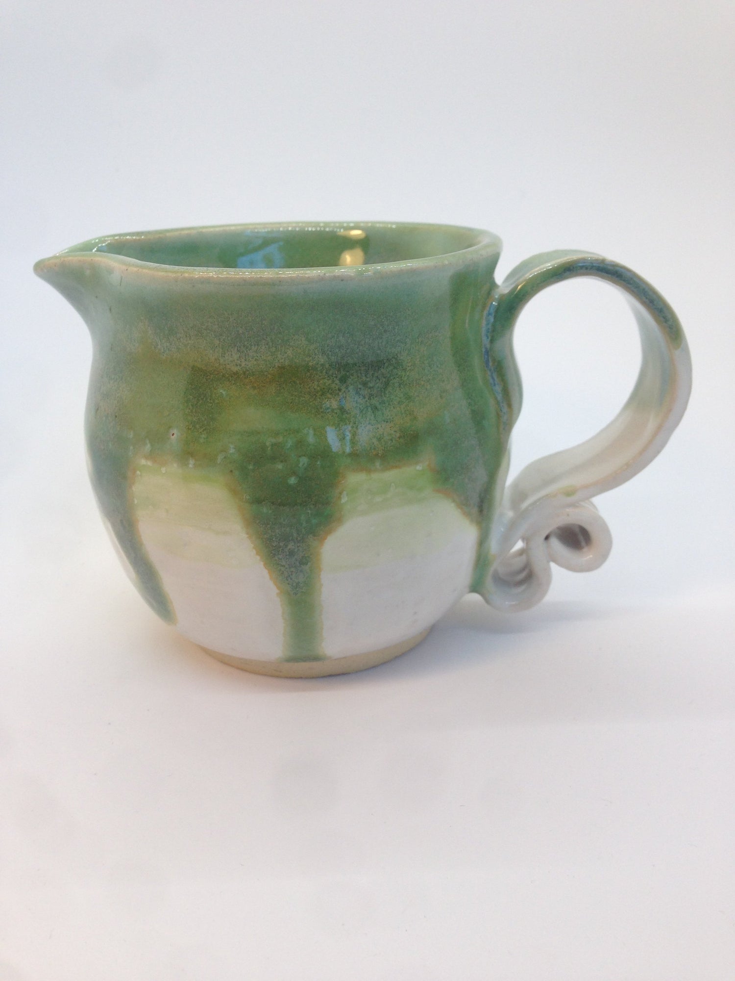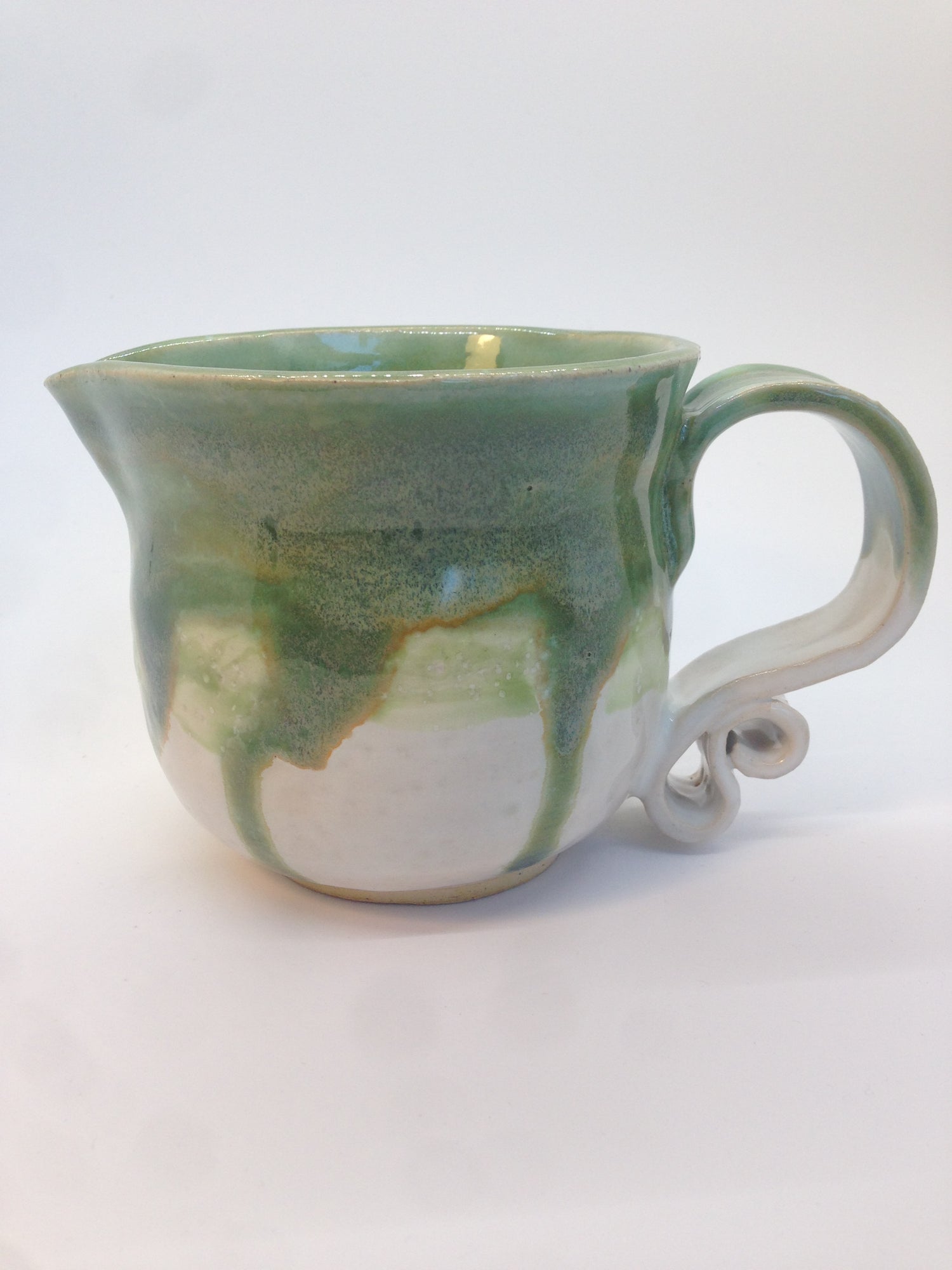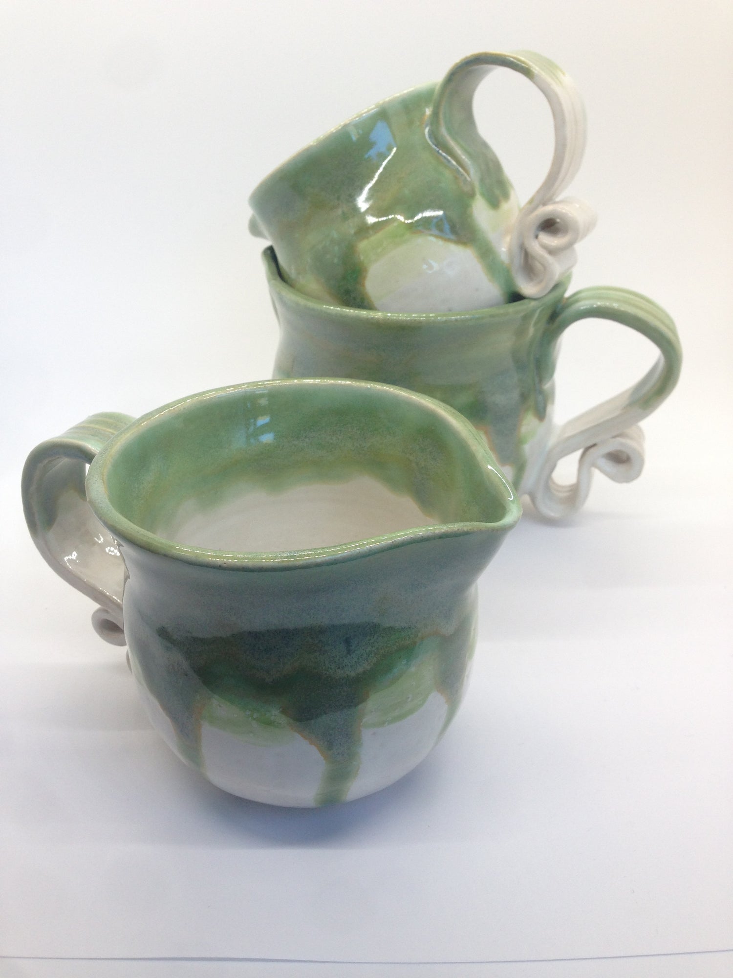 After I threw these pots on the wheel, I flared out a spout on each, and fashioned scrolling handles from a rolled slab. After I bisque fired them in an electric kiln, I painted the entirety of each piece in three layers of a soft white glaze, and another three layers of jade green on the top half, making sure to encourage some delightfully runny trails.