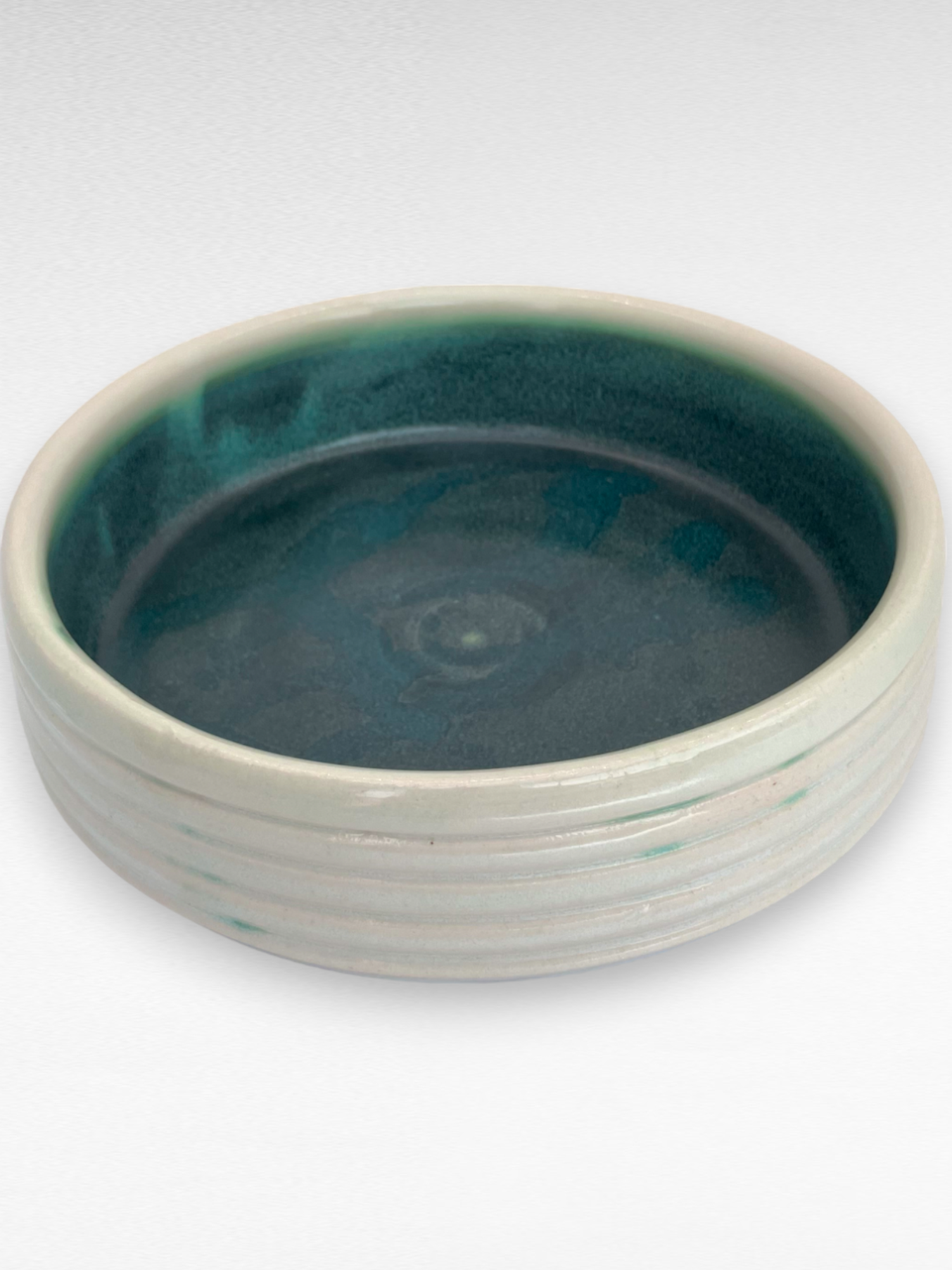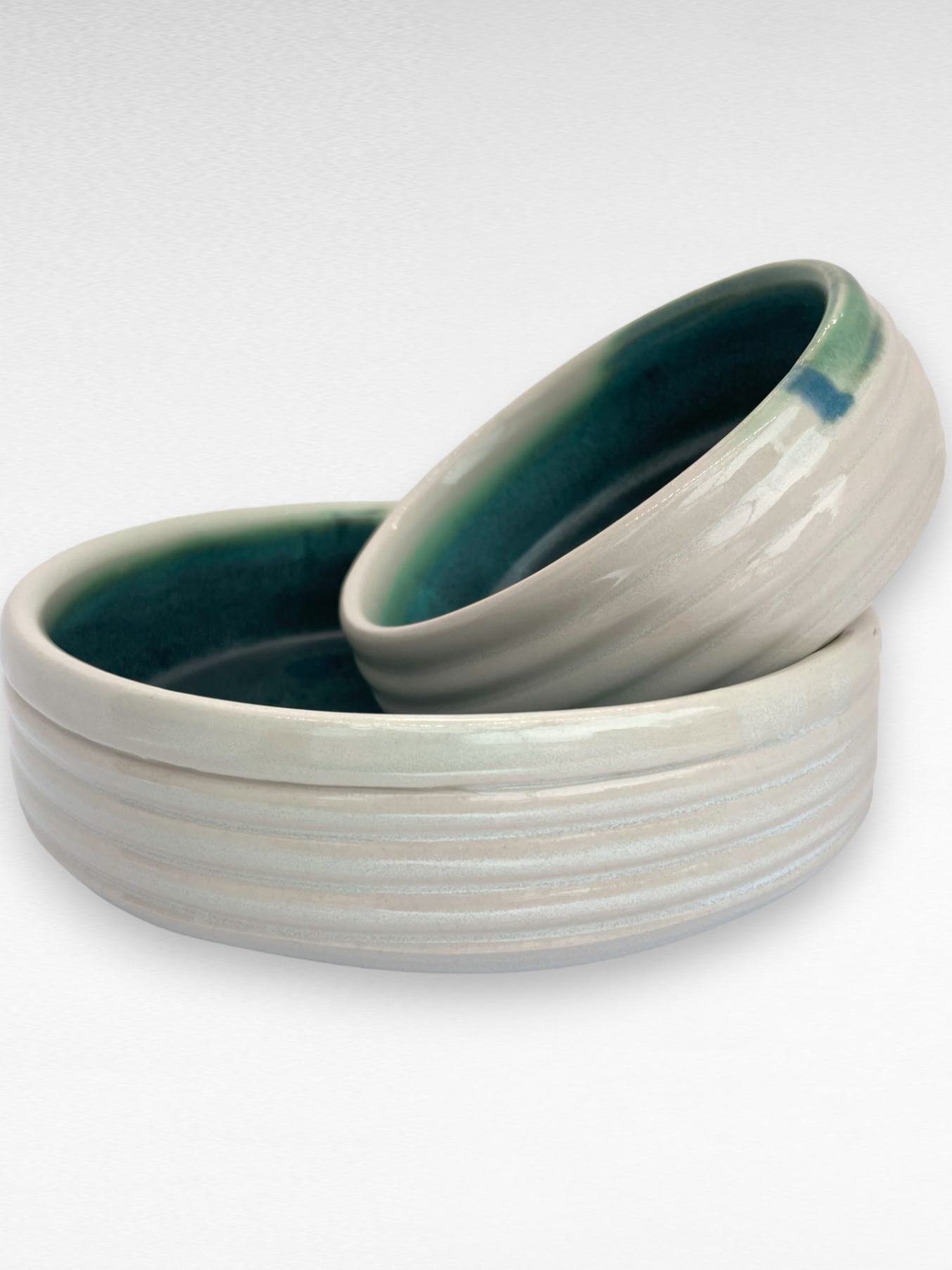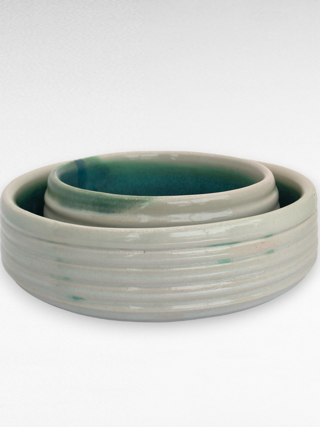 I threw these nesting dishes on the wheel, and added an undulating texture to the sides. I glazed the interior with a variegated green and added splashes of a complementary blue-green glaze.