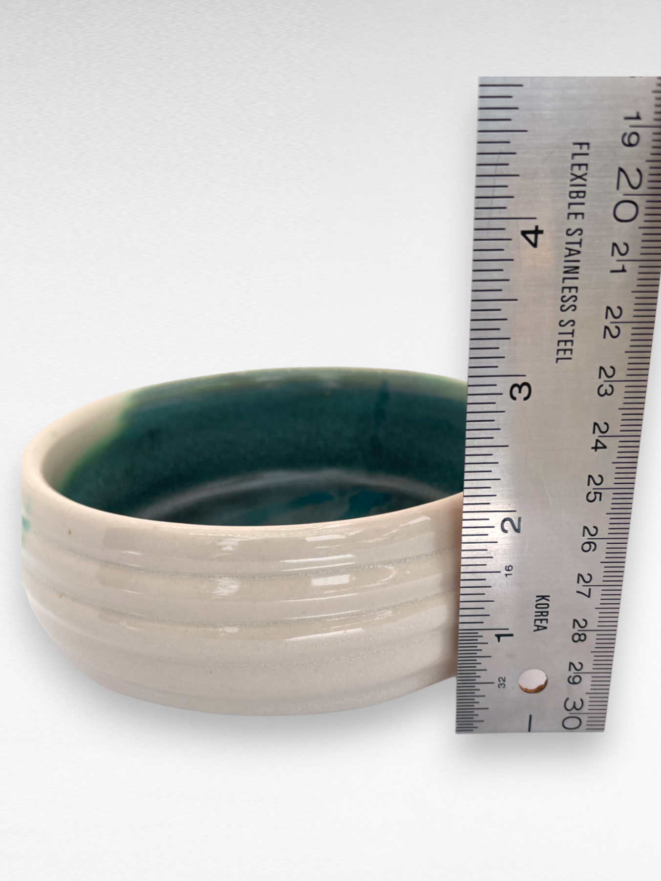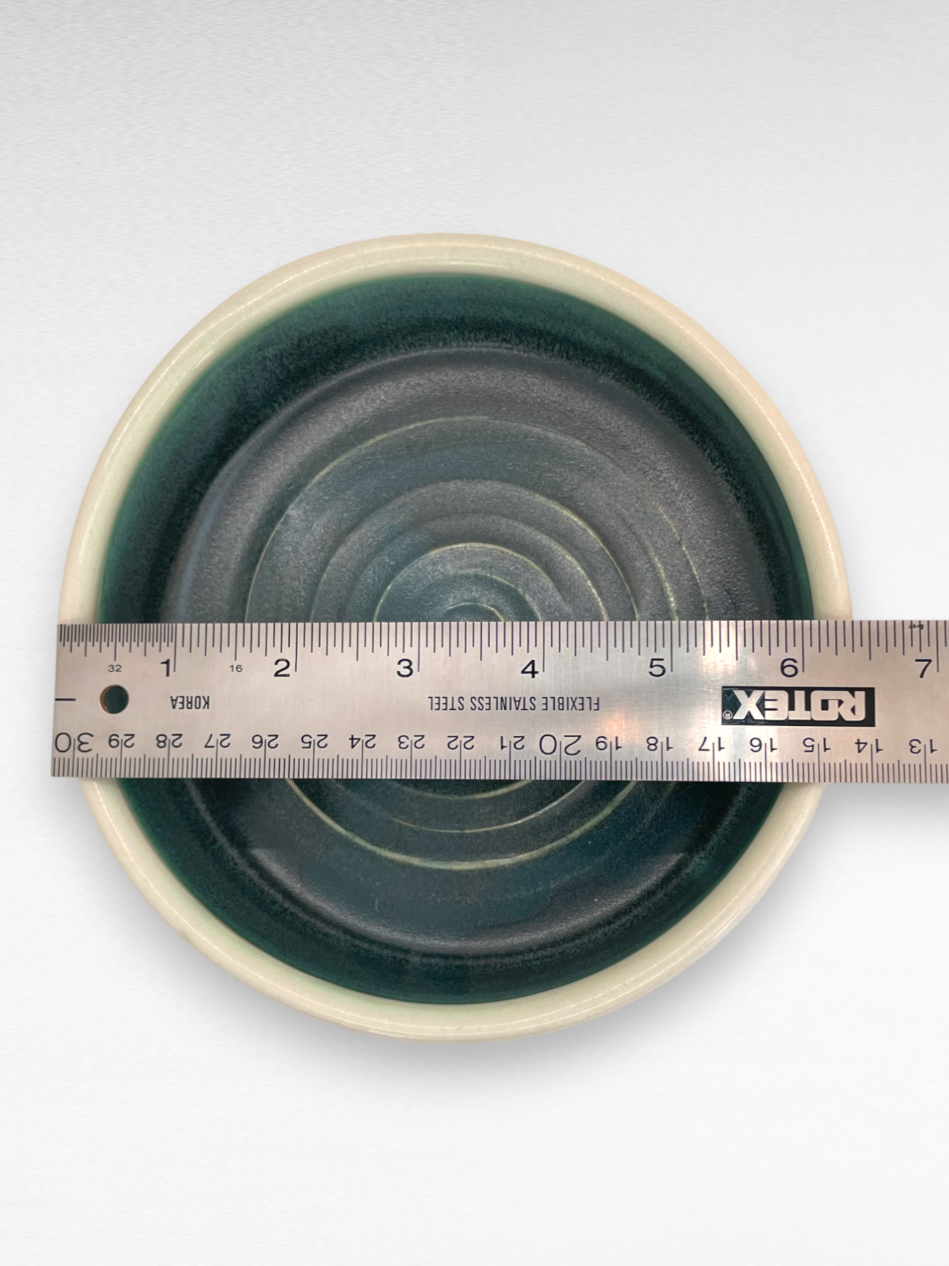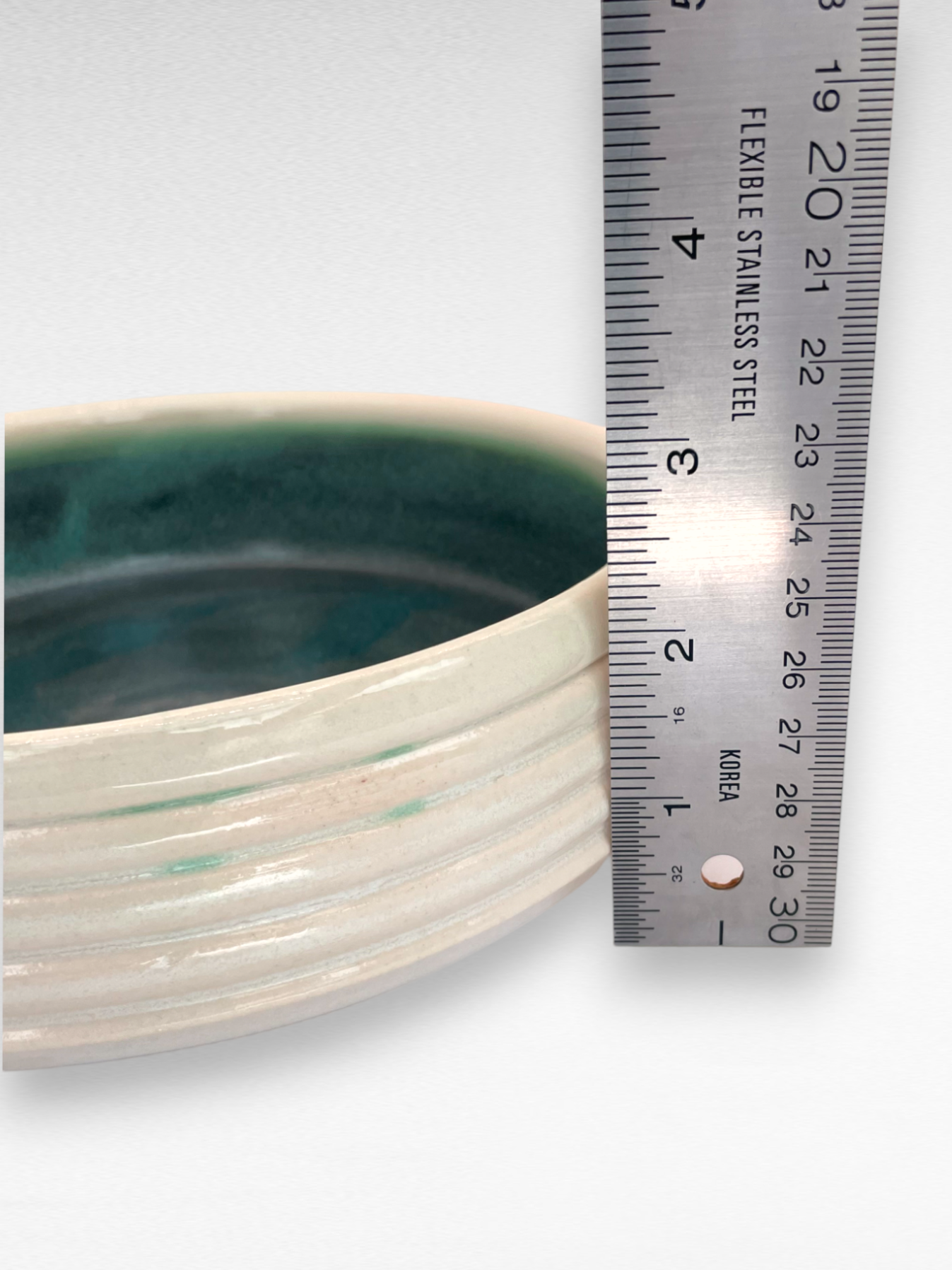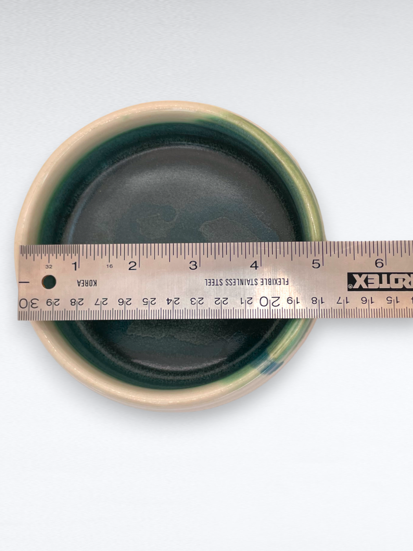 I threw these nesting dishes on the wheel, and added an undulating texture to the sides. I glazed the interior with a variegated green and added splashes of a complementary blue-green glaze.
